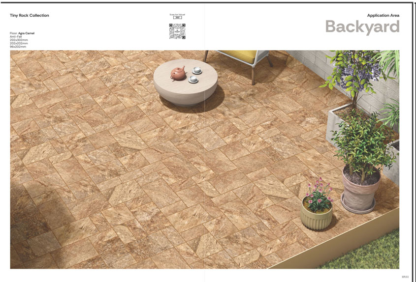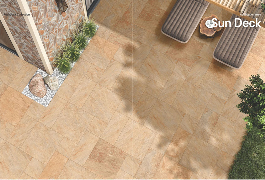 The Agra Camel ROCK-DECK tile from Simpolo's Rock Deck Collection offers a warm, earthy tone reminiscent of natural stone, making it an ideal choice for enhancing outdoor spaces such as patios, walkways, and terraces. Crafted with vitrified material, it ensures durability and resistance to weather elements, while its matte finish provides slip resistance, combining safety with style.