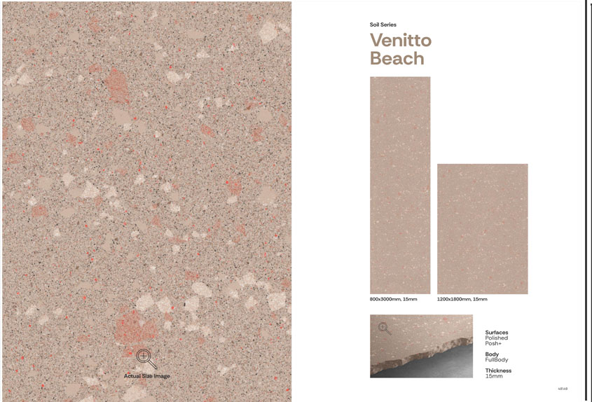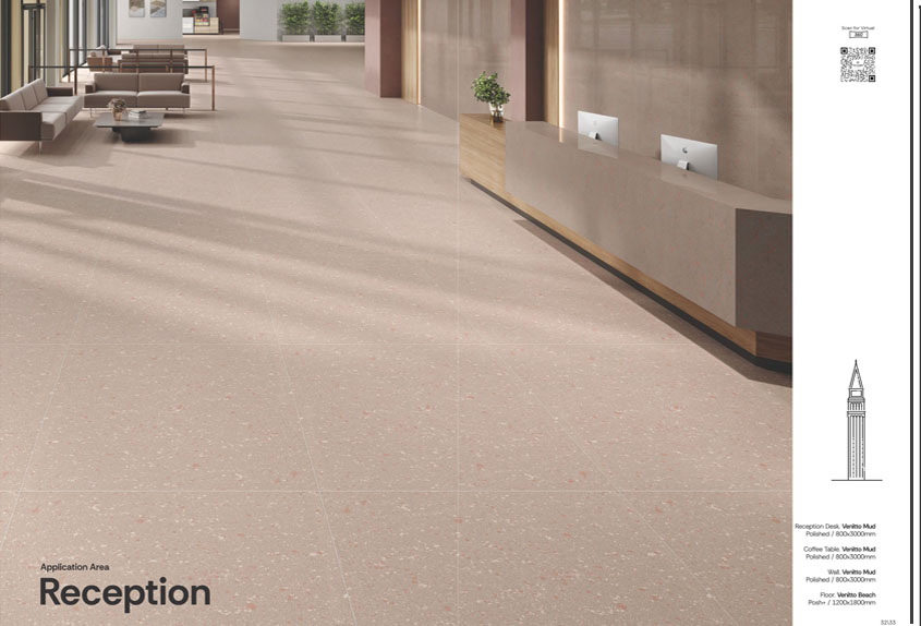 Venitto Beach vitrified tiles from Simpolo's Venitto Collection bring the timeless charm of Venetian terrazzo to contemporary interiors. Featuring a light, coastal-inspired hue with a distinctive "Chips" design, these tiles are available in large formats of 1200x1800 mm and 800x3000 mm with a 15 mm thickness, ensuring seamless coverage and minimal grout lines. Offered in both matt and polished finishes, they are suitable for wall and floor applications in residential and commercial spaces.