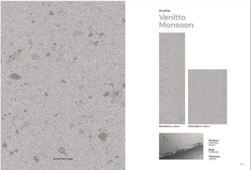 Venitto Monsoon vitrified tiles from Simpolo's Venitto Collection bring the timeless charm of Venetian terrazzo to contemporary interiors. Featuring a distinctive "Chips" design in a soothing grey hue, these tiles are available in large formats of 1200x1800 mm and 800x3000 mm with a 15 mm thickness, ensuring seamless coverage and minimal grout lines.