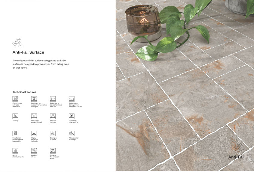 Ashlar Gry Anti-Fall Surface Vitrified Tiles are specially designed with a textured, slip-resistant finish to provide maximum safety in wet, outdoor, or high-traffic areas. Ideal for bathrooms, balconies, terraces, and commercial spaces, these tiles combine the durability of vitrified material with anti-skid properties, ensuring long-lasting performance and reduced risk of slips and falls. Stylish, sturdy, and low-maintenance.